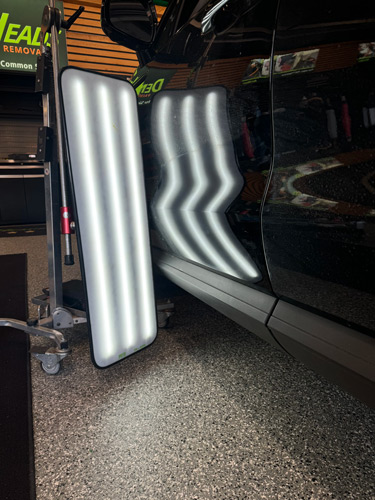 Challenge: The dent, located on the lower body line of the left rear door, was about three inches long and vertical.