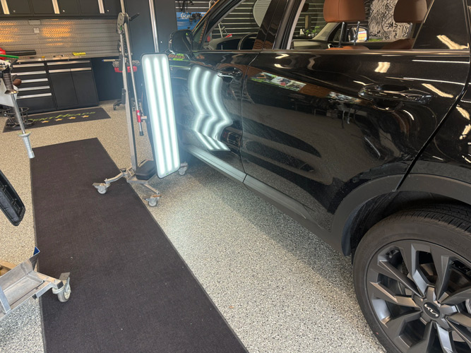 Customer & Vehicle: Barry C. of St. Paul, Minnesota, had a lease return approaching for his black 2023 Kia Sorento. Concerned about a door dent, Barry sought out Dent Heads PDR to avoid hefty lease-end charges.